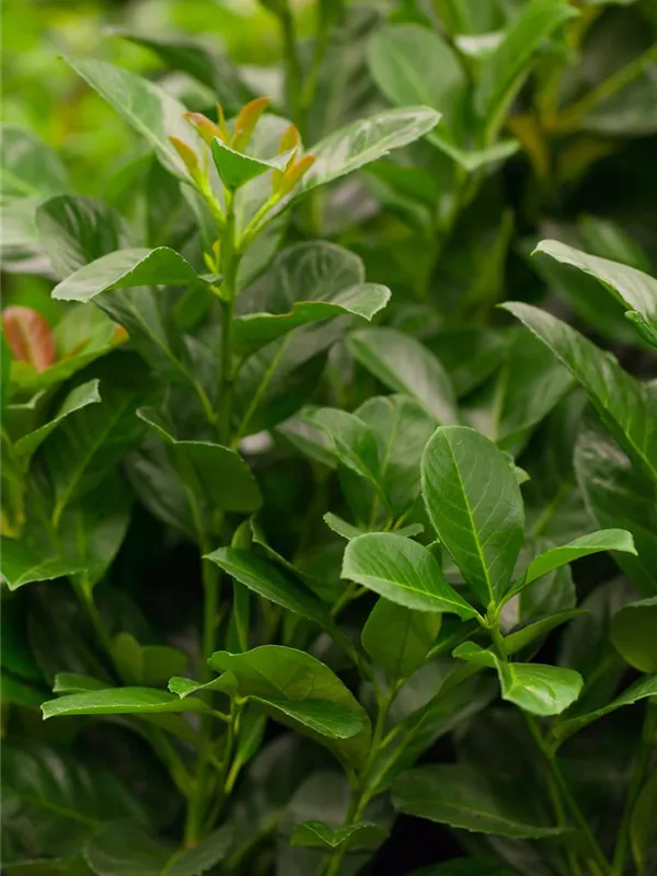 Die immergrünen Blätter der Lorbeerkirsche 'Etna'® sind dunkelgrün, eiförmig, glänzend, wechselständig. Kupferbrauner Austrieb.