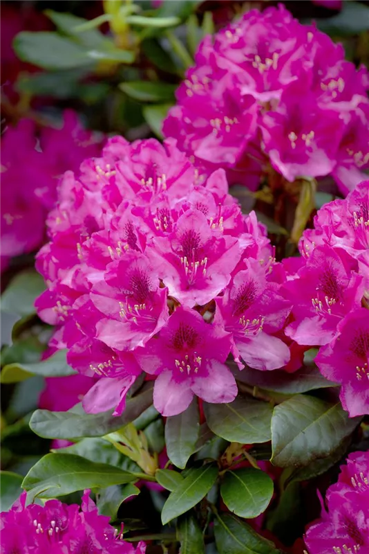 Rhododendron 'Nova Zembla' bildet von Ende Mai bis Mitte Juni zahlreiche trichterförmige, in Dolden angeordnete, purpurrote Blüten mit schwarzer Zeichnung.