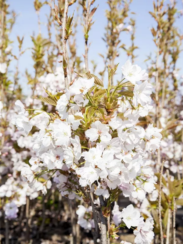 Im Frühling gibt es keinen schöneren Anblick als die Vogel-Kirsche, wenn die Mutter aller Süßkirschen uns als schneeweiße Blütenkönigin gegenübertritt. Ist das Blütenmeer vorrüber, dann wächst die Freude auf die saftigen Früchte und im Herbst färbt sich das Laub in den schönsten Nuancen. Auch die Vögel lieben die Vogelkirsche und die gefiederten Freunde werden mit Ihnen um die Wette ernten. Ein sonniger Standort und ein lockerer Boden sichern reiche Erträge.