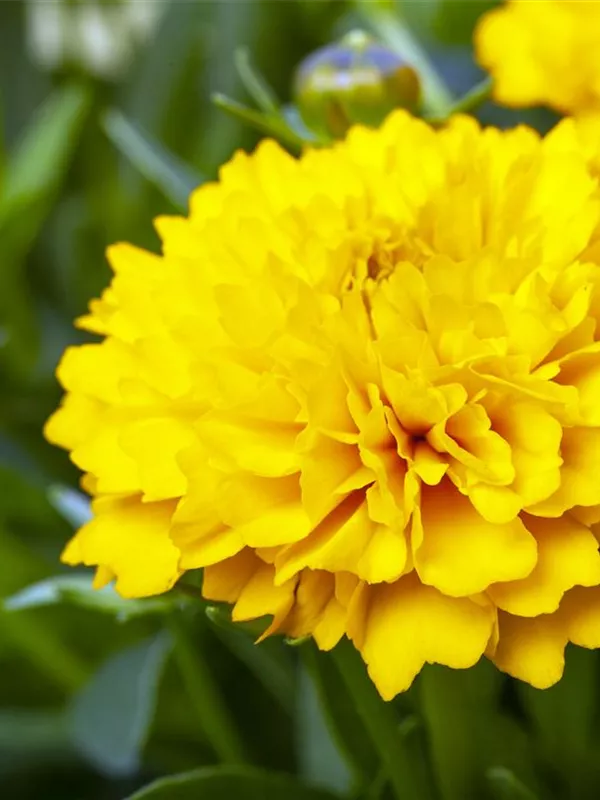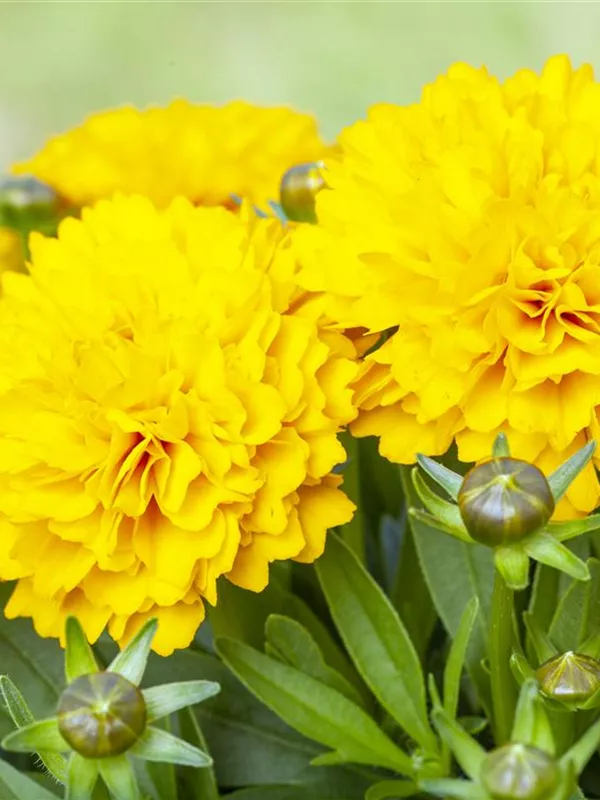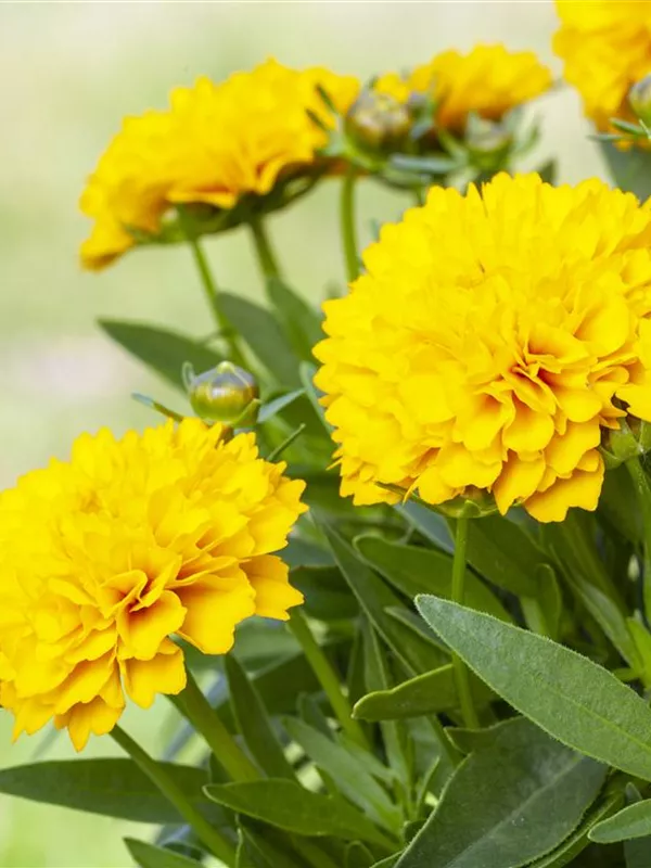 Coreopsis grandiflora, gefüllt bildet gefüllte, körbchenartige, goldgelbe Blüten ab Juni.