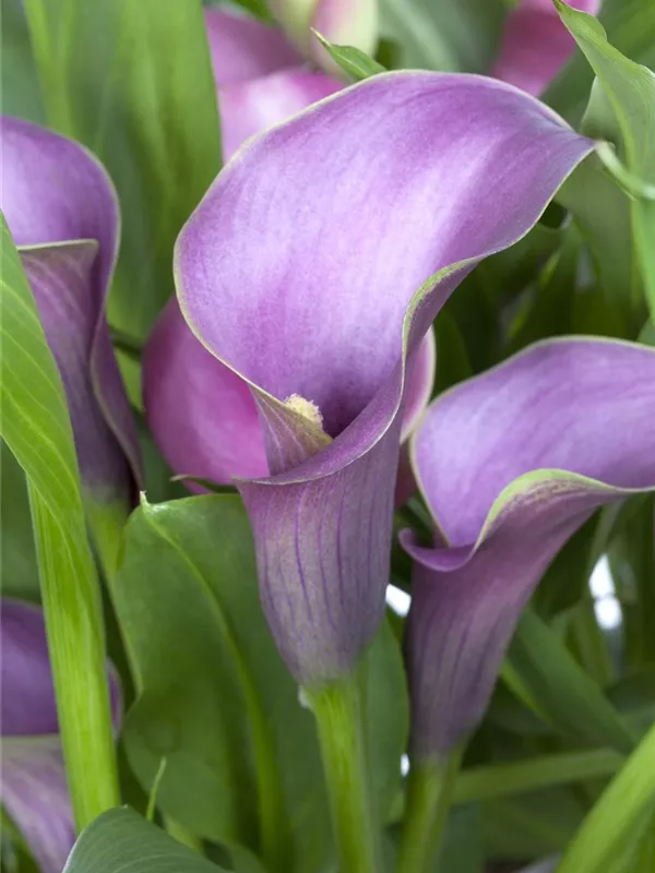 Spatha und Spadix – Liebhaber von Aronstabgewächsen werden diese Begriffe kennen. Auch Zantedeschia aethiopica trägt die charakteristischen Blüten, die mit ihrem einzigartigem Charme schon viele Menschen für sich begeistern konnten. Diese werden ausschließlich von einem intensiv gefärbten Hochblatt (Spatha) und einem ungeahnt großen Kolben (Spadix) gebildet. Ein exotischer Blickfang, der durch deutlich geaderte, herzförmige Blattspreiten komplettiert wird.
