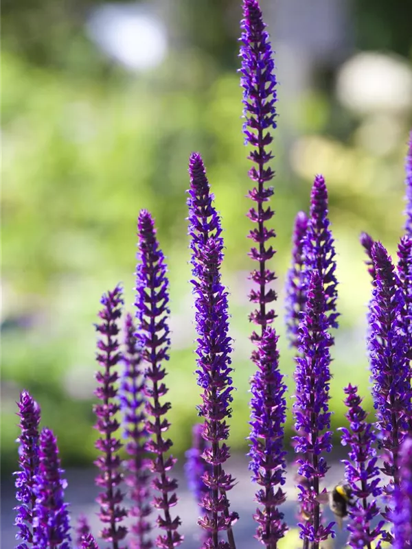 Salvia nemorosa, blau bildet lippenförmige, in Rispen angeordnete, blaue Blüten ab Juni. Diese verströmen einen angenehmen Duft. Bei richtiger Pflege Nachblüte im September.