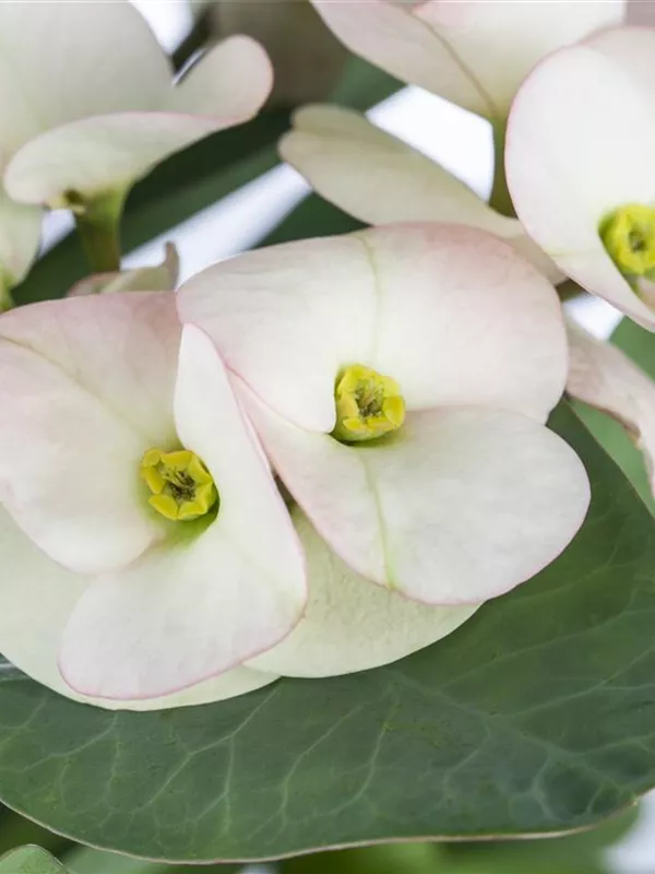Kaum zu glauben, doch diese paarigen Blätter bunter Farbenpracht werden nicht von der Blütenkrone gebildet. Es sind die umgewandelten Tragblätter von Euphorbia milii, die die Schönheit leuchtender Blüten nachahmen. Der Christusdorn besitzt wegen seiner Sukkulenz und der dornigen Äste einen ganz eigenen Charme. Zahlreiche Sorten bieten eine großzügige Auswahl aus bunter Pracht und diversen Wuchsformen.