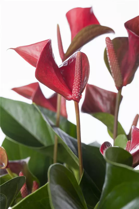 Ein großes, farbintensives Hochblatt und ein dichter Blütenkolben zeichnen die Sorten der Anthurium x andreanum aus. Der exotischen Gestalt der Blüten sei Dank, haben diese Pflanzen auch ihren Weg in die Blumensträuße dieser Welt gefunden. Als Zimmerpflanze üben die großblumigen Sorten einen besonderen Charme aus. Ein Muss für alle, die ihren Räumen einen Hauch Extravaganz einhauchen möchten!