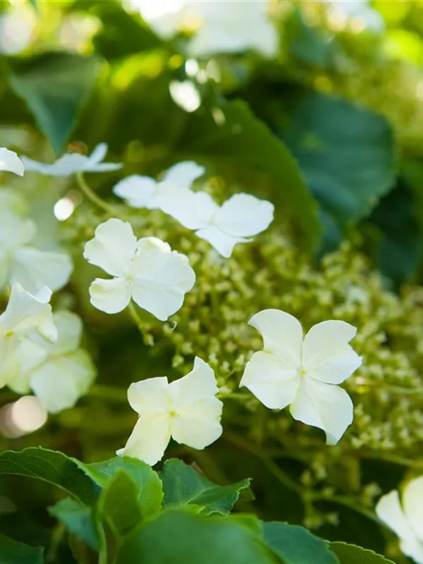 Die Kletterhortensie bildet weiße, duftende Blüten von Juni bis Juli.