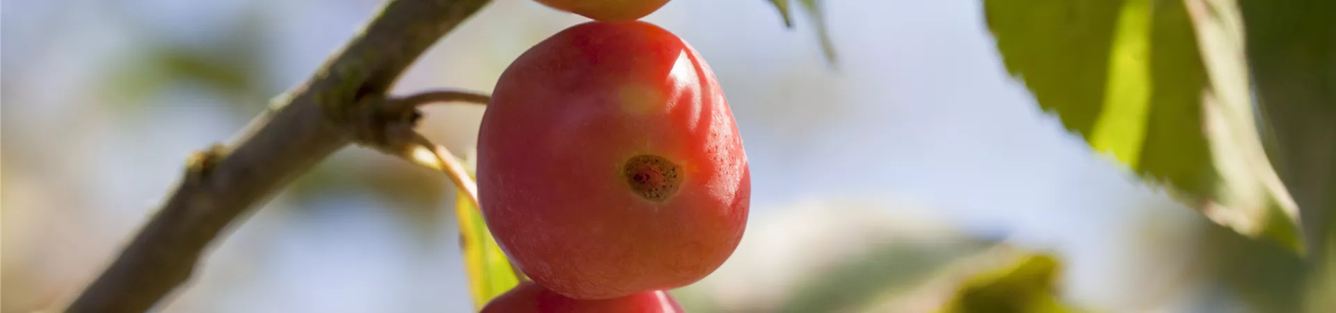 Besonders dekorativ sind die roten, runden Früchte von Malus x moerlandsii 'Red Sentinel'. Diese erscheinen ab September und sind klein. Haften sehr lange.