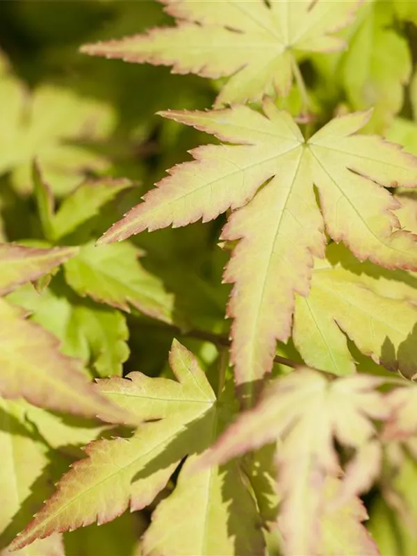Hoher Blattschmuckwert. Die sommergrünen Blätter des Fächerahorns 'Orange Dream' sind grün, gegenständig, gelappt und weisen einen hellorangenen Rand auf. Diese sind etwa 8 - 10 cm groß. Orangefarbener, früher Austrieb. Fächerahorn 'Orange Dream' zeigt sich leuchtend goldgelb im Herbst.