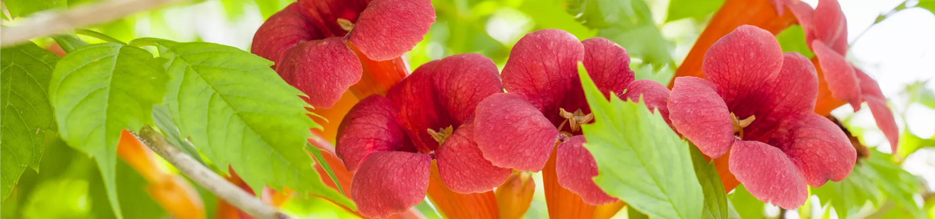 Diese verholzenden Kletterpflanzen zieren jeden Außenbereich! Gefiederte Blätter in sattem Grün wachsen schnell heran und bilden bald ein blickdichtes Laubwerk. Doch die volle Schönheit dieser Pflanzen kommt erst mit der Bildung ihrer charakteristischen Blüten zu Tage. Die großen Trompetenblumen setzten sich aus farbintensiven verwachsenen Kronblättern zusammen, die in jeder Farbe ihren Betrachter wie magisch anziehen.