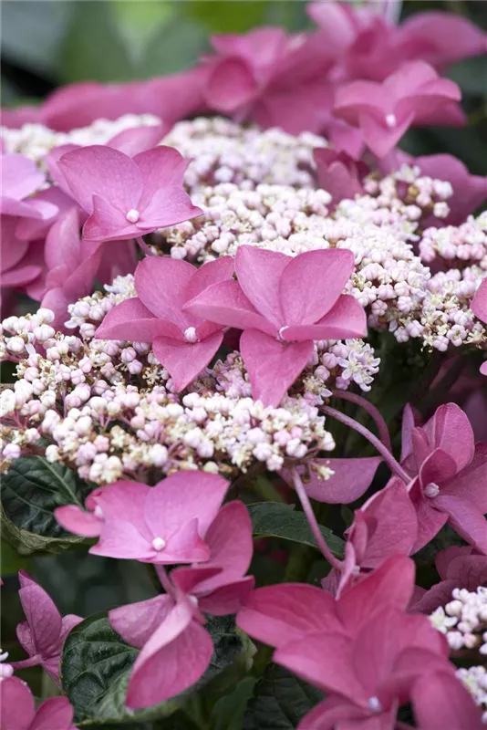 Die rosafarbenen, schalenförmigen Blüten der Garten-Hortensie erscheinen in Dolden von Juni bis September.