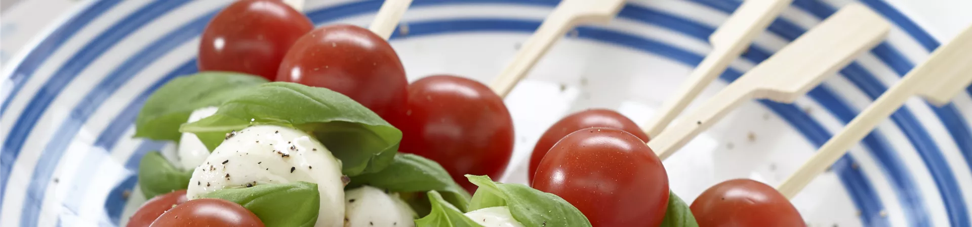 Nun streifen sie die Tomaten, den Basilikum und den Mozzarella abwechselnd auf die Spieße.