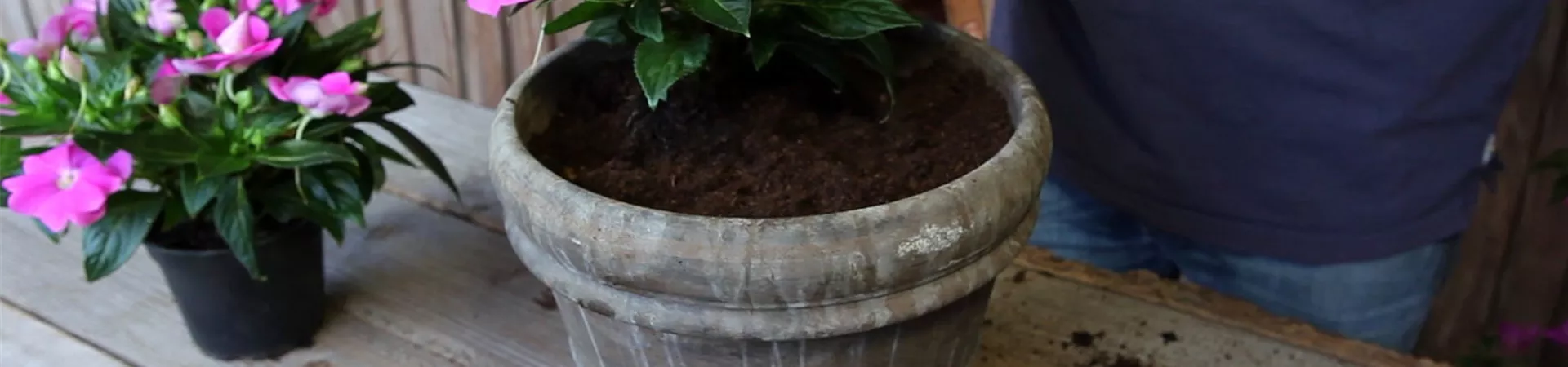 Bevor Sie handelsübliche Blumenerde in den Topf füllen, sollten Sie das Loch aber leicht bedecken: Zum Beispiel mit einer Tonscherbe. Diese verhindert, dass das Abzugsloch verstopft.
